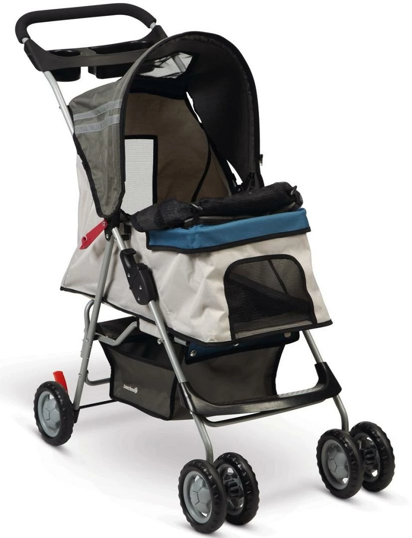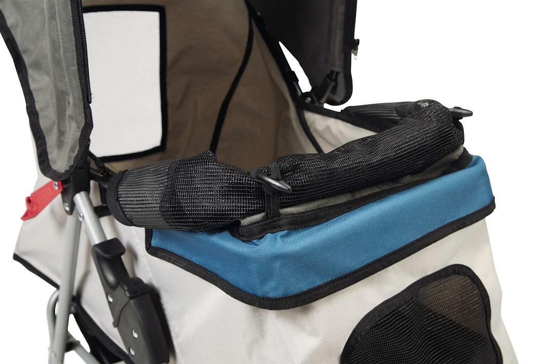 De buggy is compact en snel inklapbaar, waardoor de buggy eenvoudig is op te bergen. De buggy kan volledig worden afgesloten, maar er is nog wel voldoende ventilatie doordat gebruik is gemaakt van gaas. Onderaan is de buggy voorzien van een boodschappenmandje, zodat je er spullen in op kan bergen. Handig detail: er is een bevestigingsmogelijkheid voor een tuigje of halsband.
