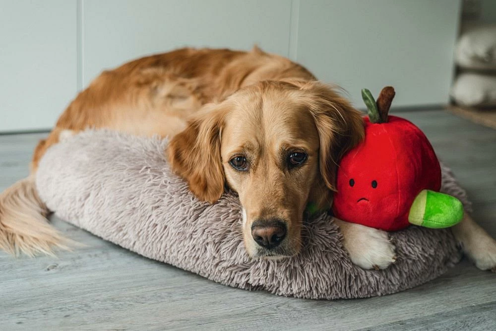 De pluchen rups kan namelijk in zijn geheel uit de appel gehaald worden. Zal jouw hond dit denkspel snel door hebben?