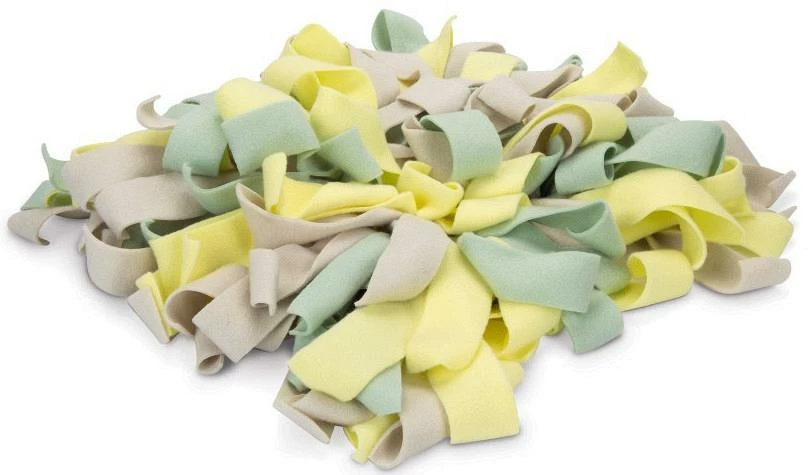 Deze mat bestaat uit allemaal verschillende gekleurde stroken, kort en lang. De mat is gemaakt van joggingstof en voelt lekker zacht aan voor de neus. Zorg er wel voor dat jouw pup niet op de mat gaat bijten of kauwen.