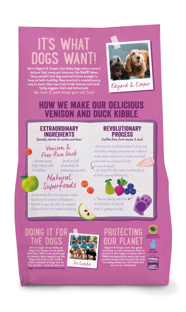 In Edgard & Cooper hondenvoer Adult hert en scharreleend wordt enkel vers hert en verse scharreleend gebruikt en absoluut geen bewerkt, overgaar of gedroogd hert en eend of meel van hert of eend dat moeilijker is voor de buikjes om te verteren. Daarnaast wordt er een supergezonde mix van fruit, groenten en kruiden toegevoegd.