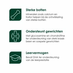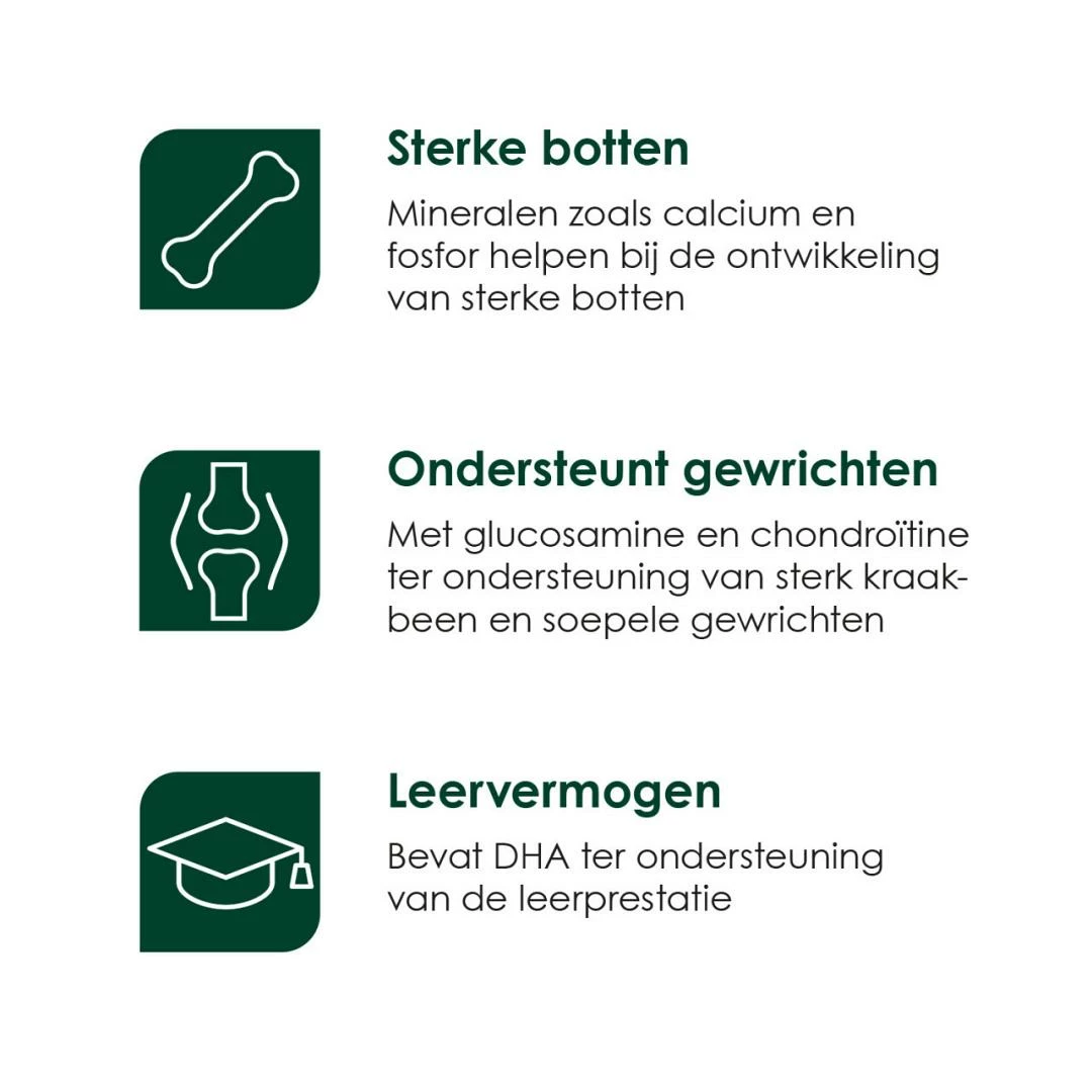 | Ondersteunt gewrichten Met glucosamine en chondroïtine ter ondersteuning van sterk kraakbeen en soepele gewrichten.  | |