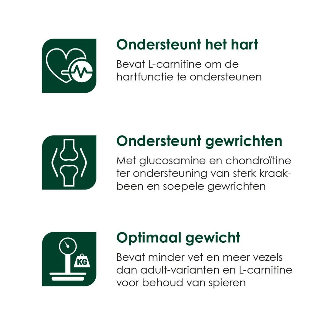 | Â | Optimaal gewicht Bevat minder vet en meer vezels dan adult-varianten en L-carnitine voor behoud van spieren. |