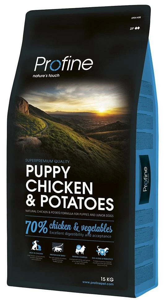 Profine Puppy Chicken & Potatoes is een natuurlijke formule met kip en aardappel voor pups en jonge honden.