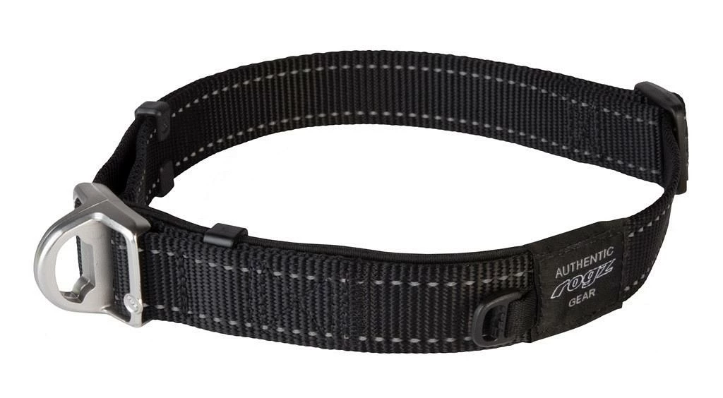 De Rogz Beltz Utility halsband Safety is een duurzame nylon halsband die speciaal is ontwikkeld voor de veiligheid van je hond. De magneetsluiting met twee gespen zal zich openen als bijvoorbeeld bij het spelen met een andere hond te uitbundig wordt getrokken of als de halsband ergens aan blijft hangen. Als de sluiting zich opent, zal het elastiek (dat achter de sluiting zit) ruim uitrekken zodat je hond veilig kan ontsnappen.