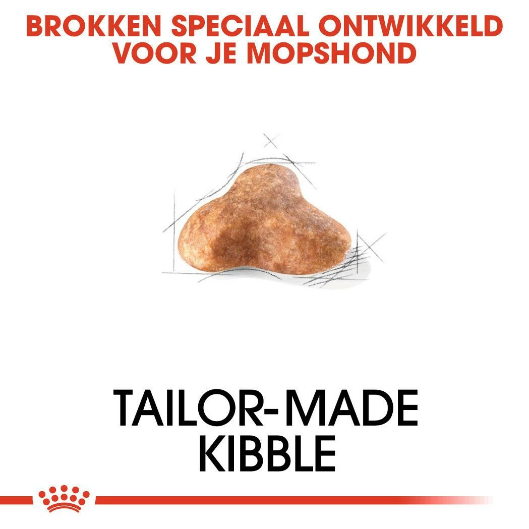 Geen volgzamere hond dan je Mopshond. Hij is gevoelig, vrolijk en trouw. Aandacht vindt hij heerlijk, en je Mopshond is dan ook graag in je gezelschap. Deze hond heeft wel een aantal aandachtspunten, zoals zijn gewicht en zijn ademhaling. Vooral tijdens warme dagen kunnen de dikke tong, het zachte gehemelte en de kleine neusgaten voor problemen zorgen. Zeker als hij (iets) te dik is. Speciaal voor de gedrongen Mopshond is er Royal Canin Pug Adult.