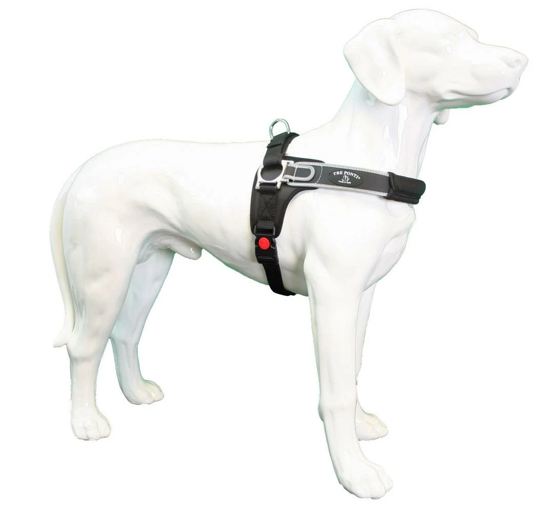 Het bijzonder innovatieve ontwerp geeft de hond een ruime bewegingsvrijheid, zoals bij alle Tre Ponti tuigen. Het tuig heeft geen negatieve drukpunten, echter bij het strekken van de lijn krijgt de hond een pijnloze en lichte druk op de zijflanken. Dit zal bij elke hond een reactie uitlokken. De hond zal meteen inhouden, of stil blijven staan en naar u omkijken om te zien wat er aan de hand is. Door deze reactie te belonen kan het vervelende trekken van de hond beheersbaar worden en met de juiste aanpak zelfs volledig worden afgeleerd. Â Deze bijzonder innovatieve tuigen zijn sterk en reiken u de ’tools’ aan om negatief gedrag, het trekken en uitvallen aan de lijn, op een eenvoudige wijze te kunnen doorbreken en/of te beheersen.